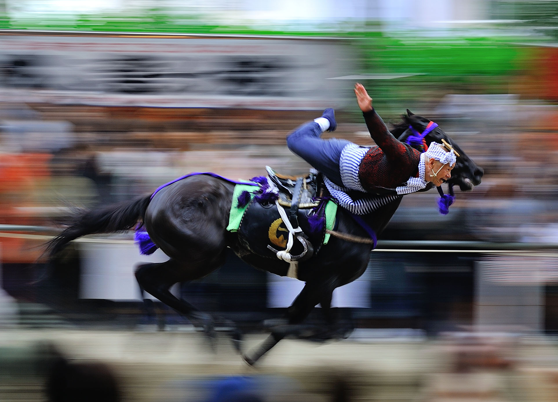 手綱潜りの瞬間を、見事な流し撮りで撮影した一枚です。駈馬を捉えるための場所、タイミング、シャッター速度や技法全ての選択において高い技量と経験が感じられます。古くから伝わる文化を次代に伝える、重要な記録として機能する資料であり、また躍動感を表す優れた写真表現でもあります。