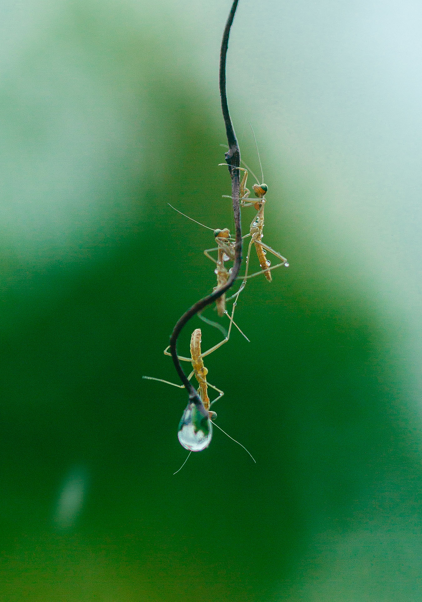 少し冷たさを感じる色調でありながらも、春の訪れを知らせてくれる作品です。濃い緑の背景に黄色の被写体、曲線が印象的な枝と丸い水滴と直線的なからだ。シンプルな構図の中に見どころがたくさんありつつも、作者の高い技術力と素晴らしい表現力により、生まれたてのカマキリたちの生命力を強く感じます。