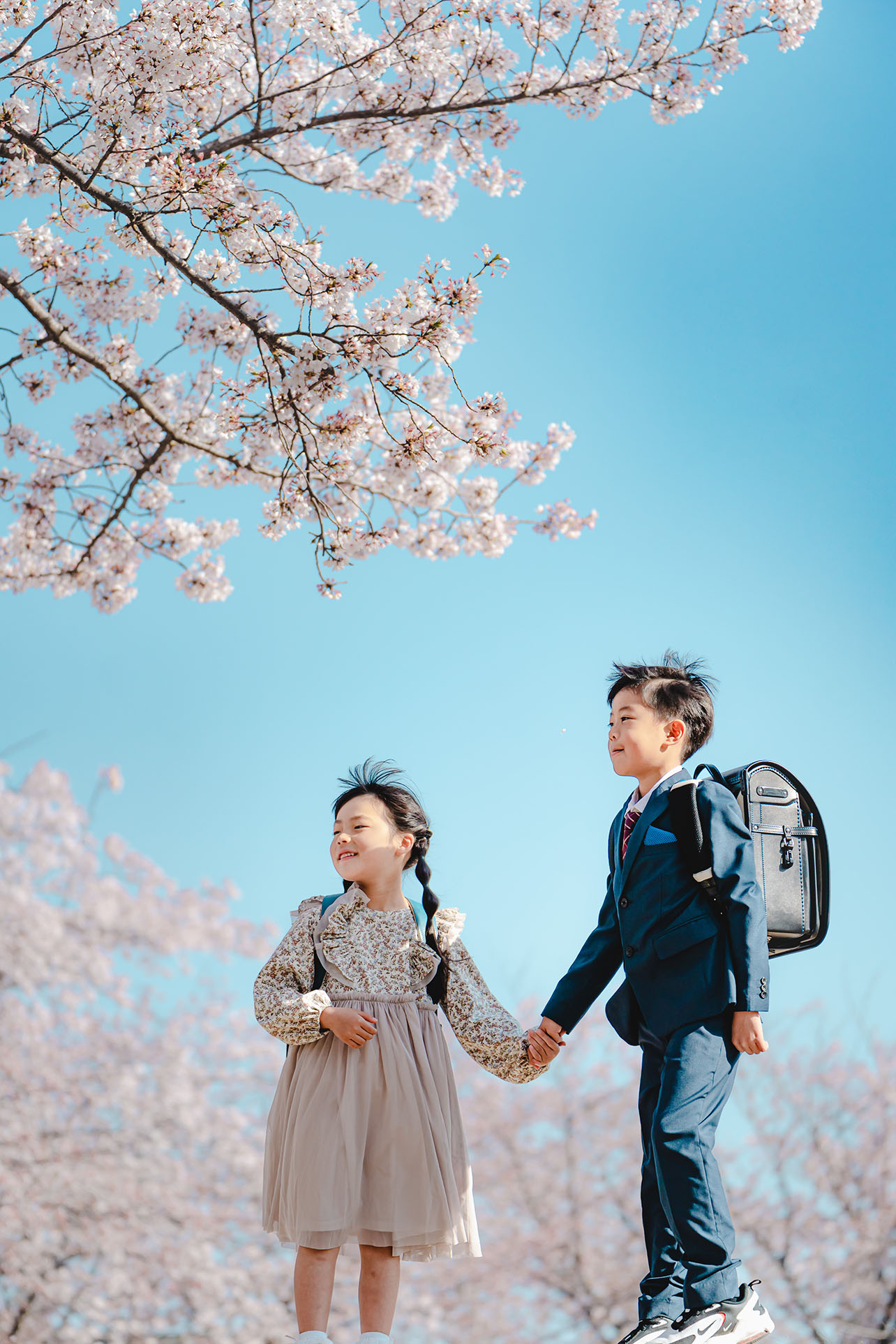 麗らかな春の日差し、暖かい風に吹かれて、気持ちよさそうなふたりの表情が清々しく、春の心地良さを絶妙に表現しています。効果的な被写界深度を選択した背景の桜のボケ味と、澄み切った青い空が、主役の子どもたちの存在を引き立たせています。